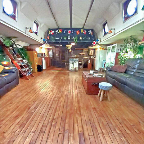 On the deck level, there is a dedicated office area, while the wheelhouse — currently used for storage — could be converted into a bright day lounge with panoramic views. Heating and hot water are provided by a log burner, LPG boiler, and cast-iron radiators, ensuring warmth and comfort all year round.